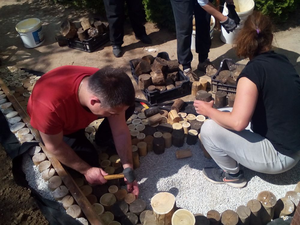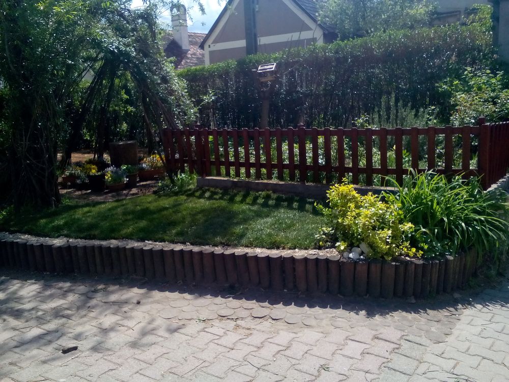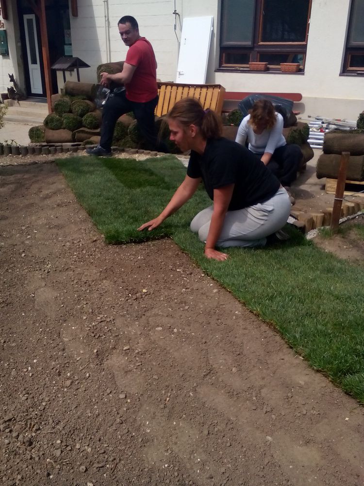 Egy hét kitartó locsolás után könnyen felrotálta egy volt szülő a kertet, majd 20 kg marhatrágyát (biogazdálkodásban is használhatót) szórtunk ki. Szedegettük a köveket, cserepeket, gereblyéztük. Úgy látszott nagyon sok helyen lefolyik a föld, így megkezdtük a kertépítést is, melyet már régóta terveztünk. Az ügyeletbe többünknek be kellett jönni, így munkához láttunk. Az anyagbeszerzés, fuvarozás nem kis gonddal járt. Vödrökkel, lapátokkal felszerelve jelentünk meg a tüzépen, hogy murvát vigyünk az alapokhoz. 7 alkalommal jelentünk meg, a számlakészítő már törzsvevőként üdvözölt bennünket. A néhány éve oszlopsorral készített kistámfalak lerakásának technológiáját akkor ellestük, így Harta Andival, Beával szinte tökéletesen sikerült, nagyon jó lett. Ildikó folyamatosan locsolt, hogy a föld eléggé nedves legyen, mire a gyepszőnyeg megérkezik és azt követően is. Végre elérkezett a gyepszőnyeg leterítésének napja. Nagyon nagy lelkesedéssel kezdtünk neki, főleg annak tudatában, hogy mindent sikerült előkészíteni és befejezni. Hatan láttunk a feladatnak: Erzsi, Bea, Andi, Vankó Dani (Ibolya férje- szülő) és Juhász Tibor (szülő, aki látott már ilyet közelről) és én. Igazán jó munka volt a 100 m 2 gyepszőnyeg behordása és leterítése. Azóta is rendszeresen, felváltva locsoljuk, már szépen erősödik, az első fűnyíráson is túl vagyunk!